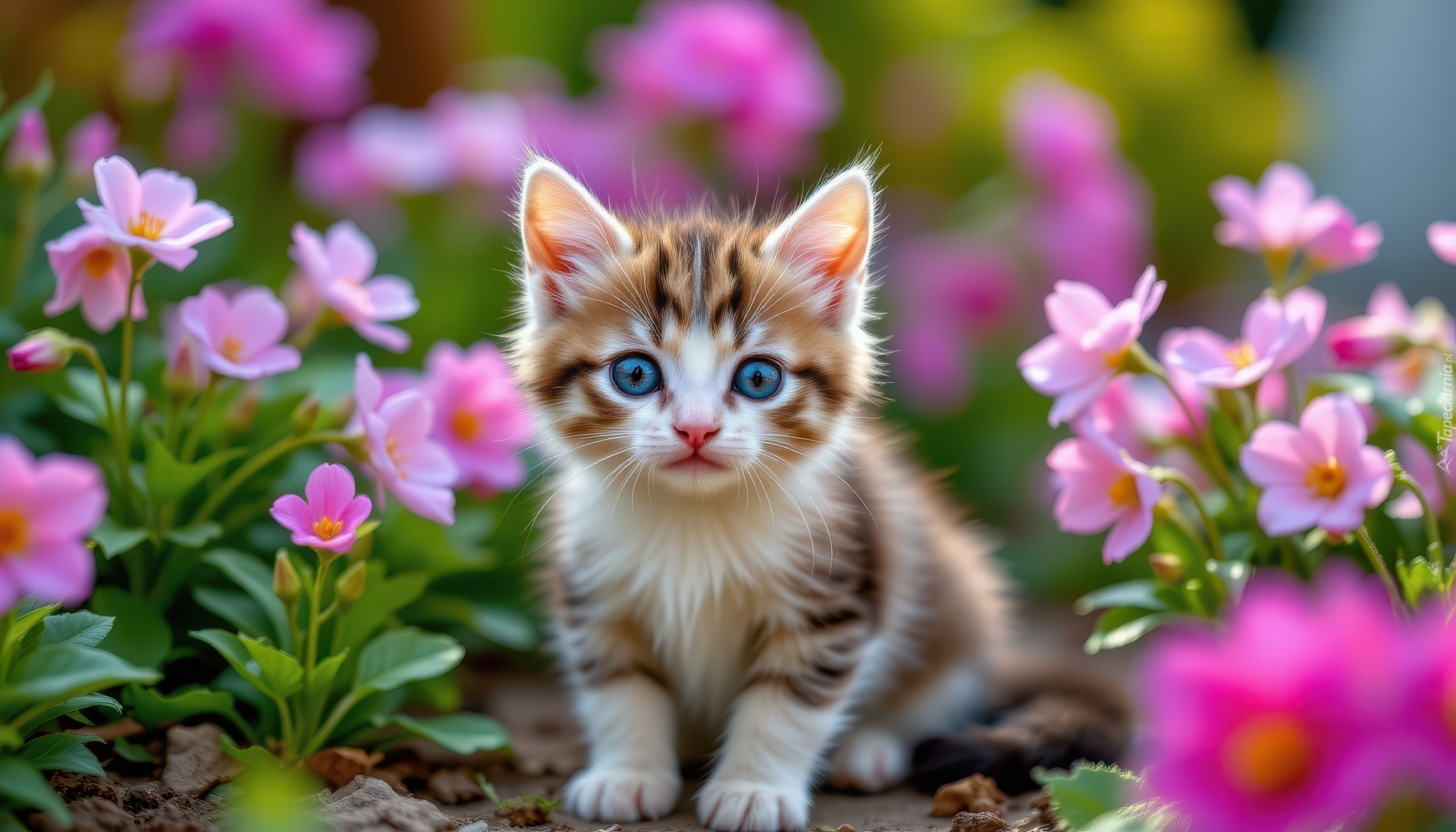 Edytor tapety: Mały kotek wśród różowych kwiatów