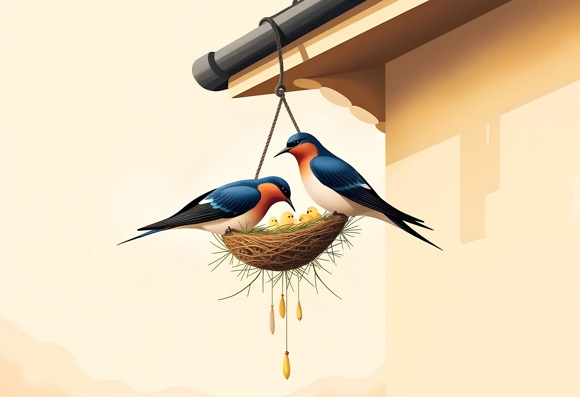 Edytor tapety: Jaskółki z młodymi w gniazdku pod dachem domu