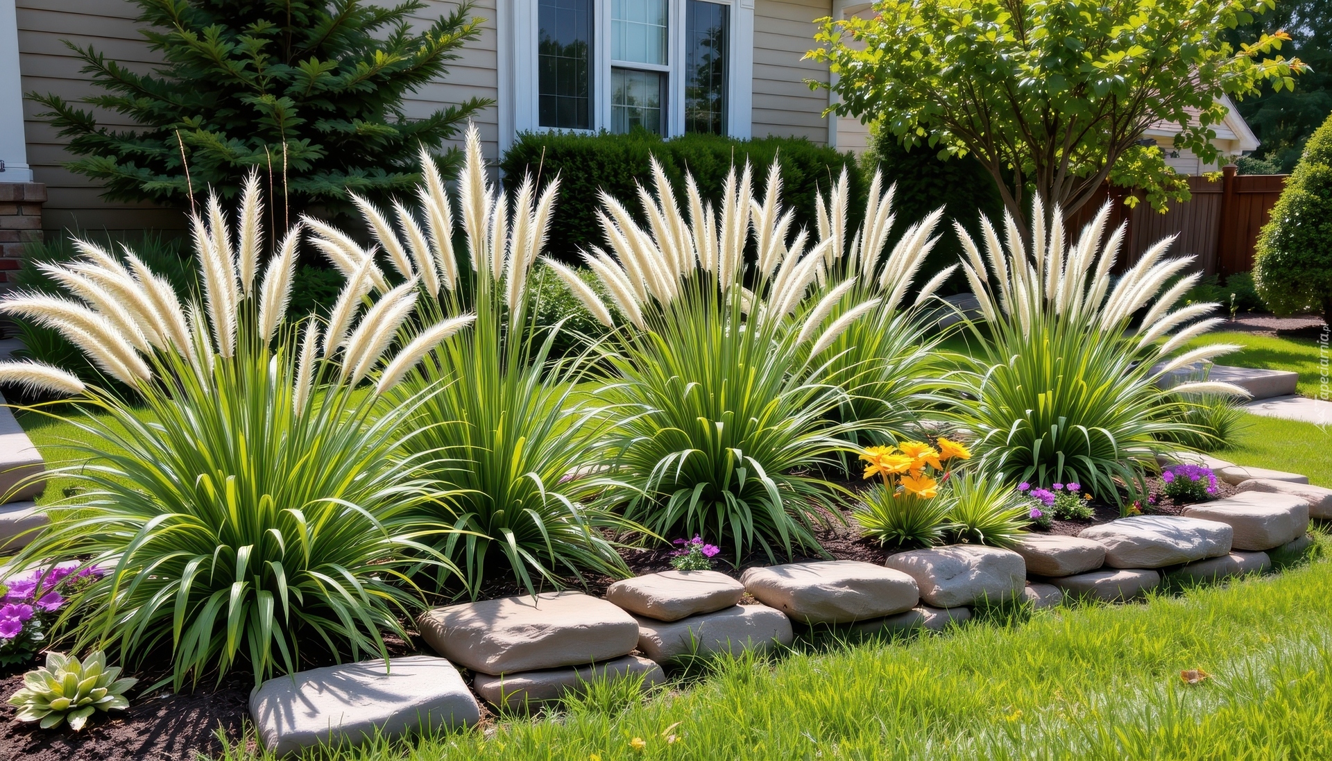 Edytor tapety: Klomb z trawami ozdobnymi i kwiatami przed domem