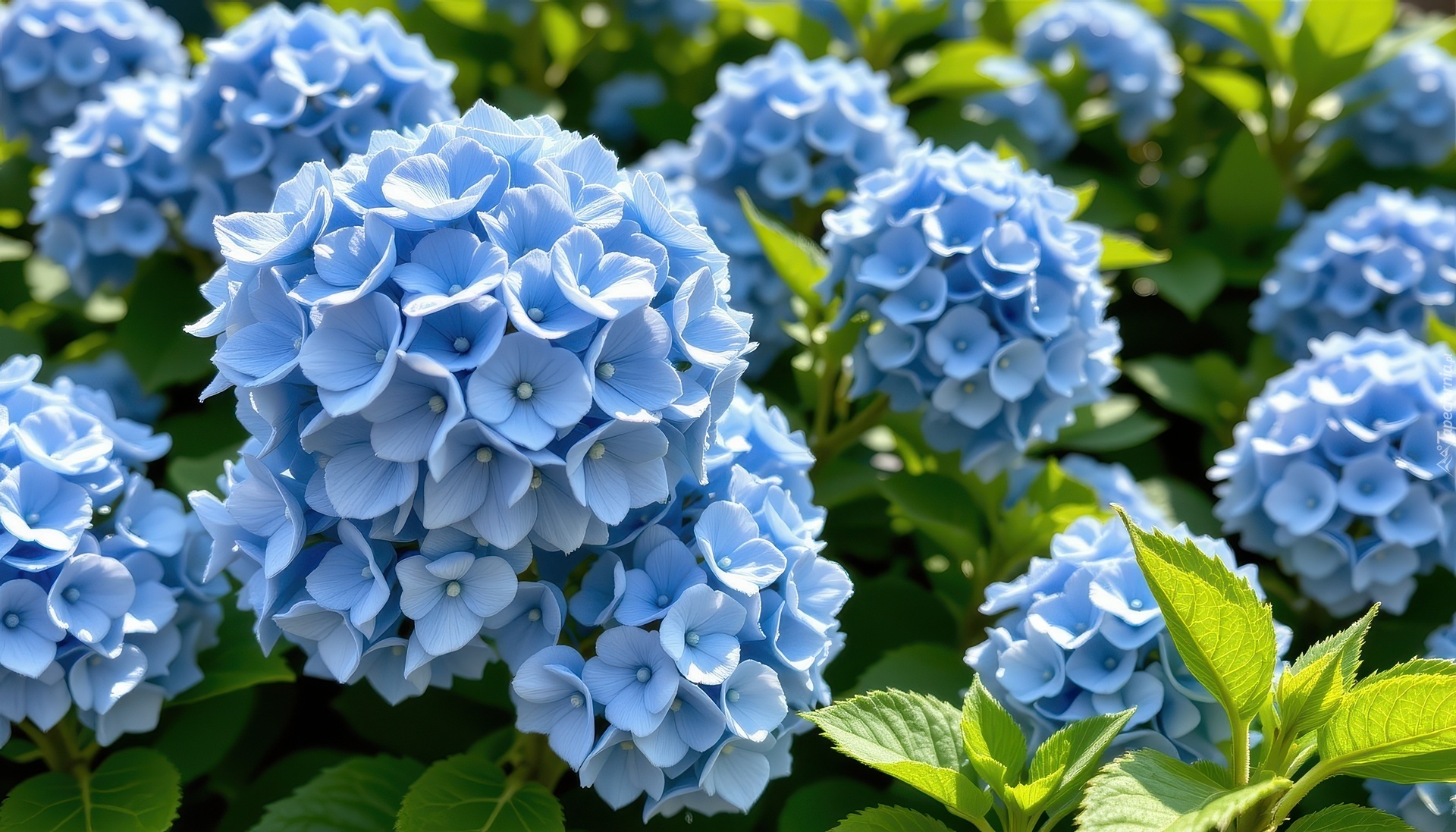 Edytor tapety: Niebieskie kwiaty hortensji z listkami