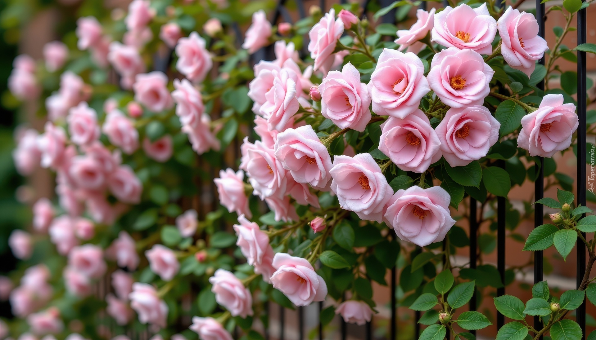 Edytor tapety: Pnące jasnoróżowe róże na metalowym ogrodzeniu