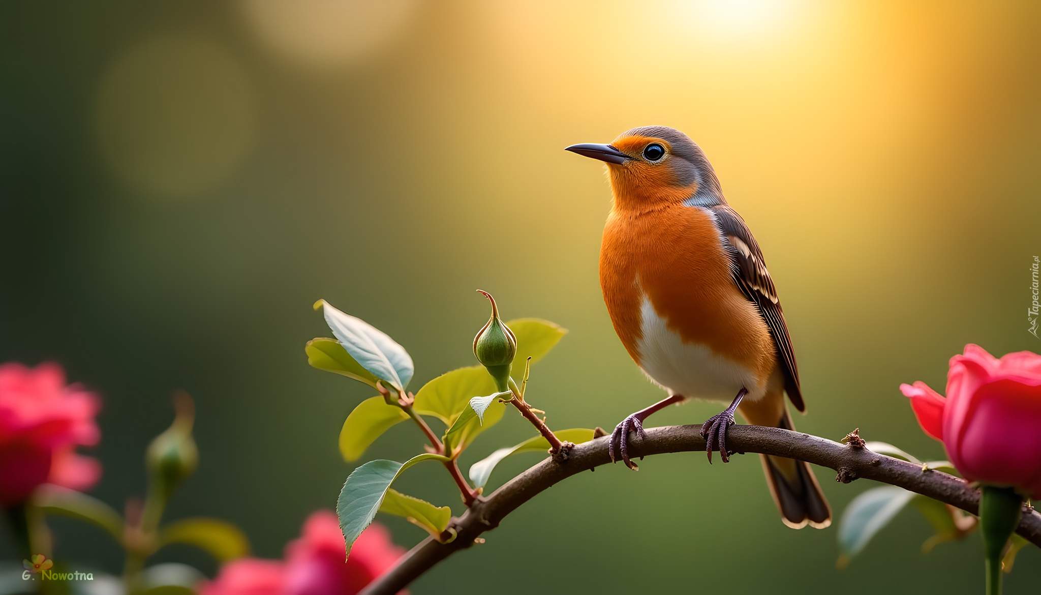 Edytor tapety: Rudzik i róża z pąkiem na gałązce