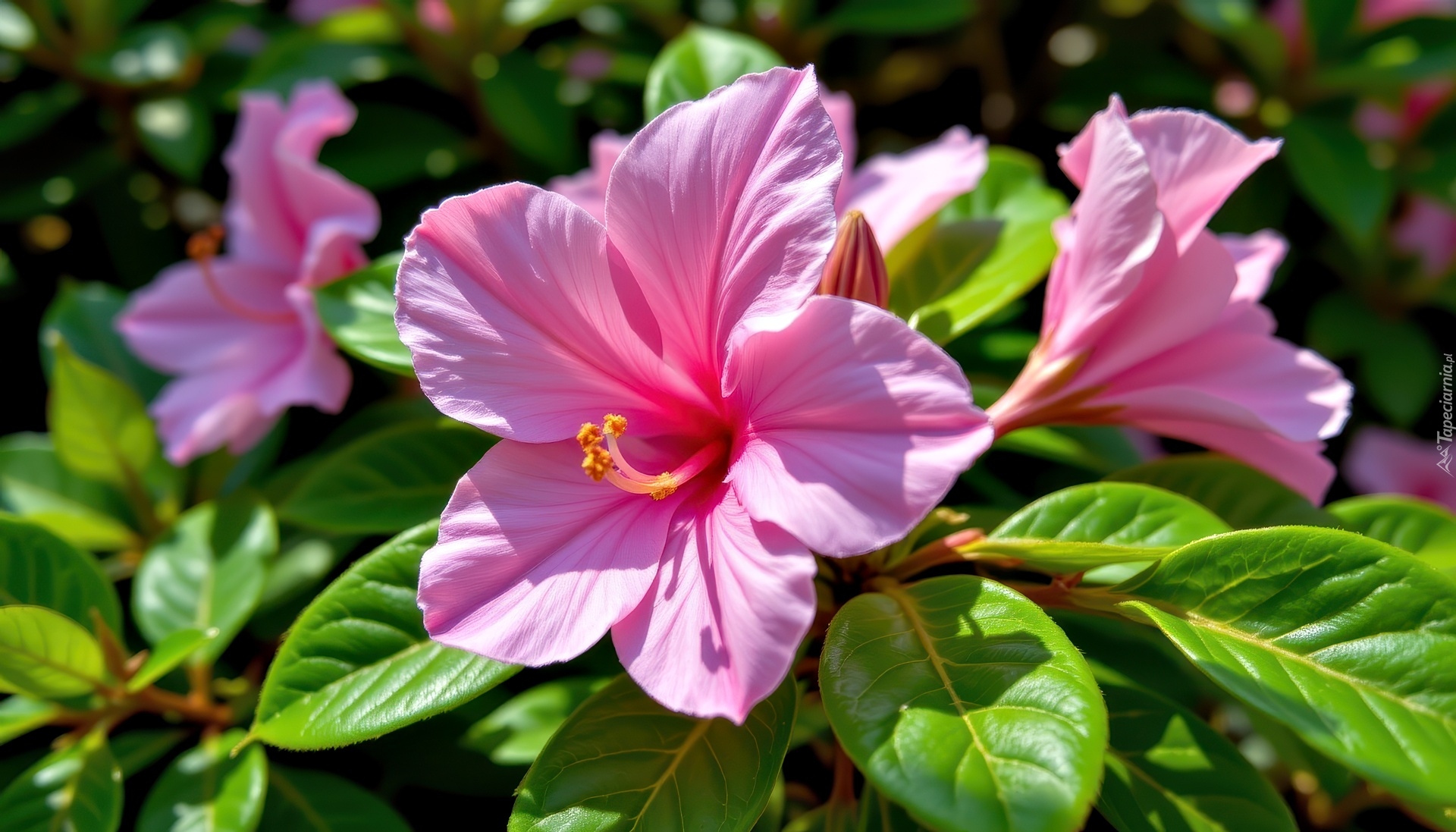Edytor tapety: Rozwinięte kwiaty różowej azalii z liśćmi