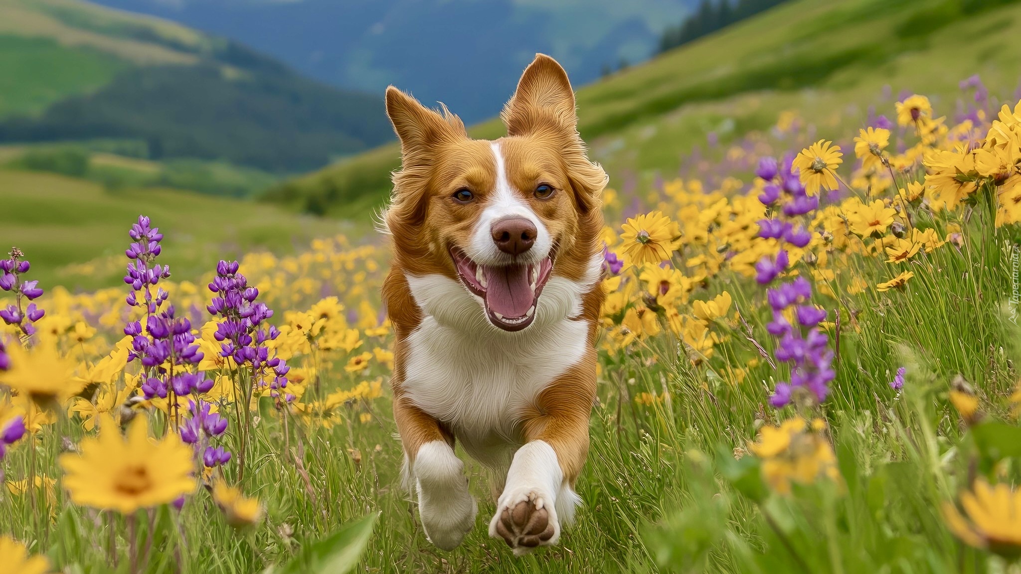 Edytor tapety: Biegnący pies przez łąkę z kwiatami i trawą