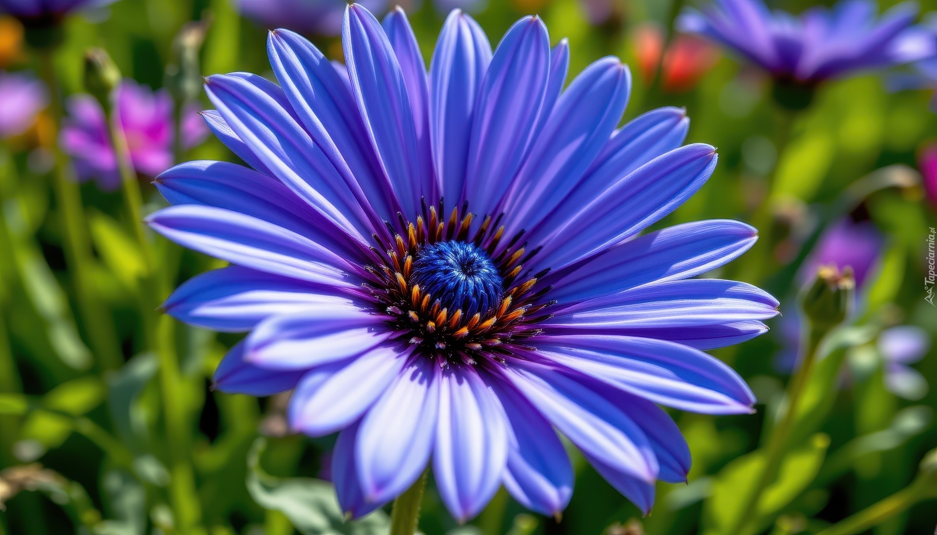 Edytor tapety: Rozświetlony kwiat niebieskiej stokrotki afrykańskiej w zbliżeniu