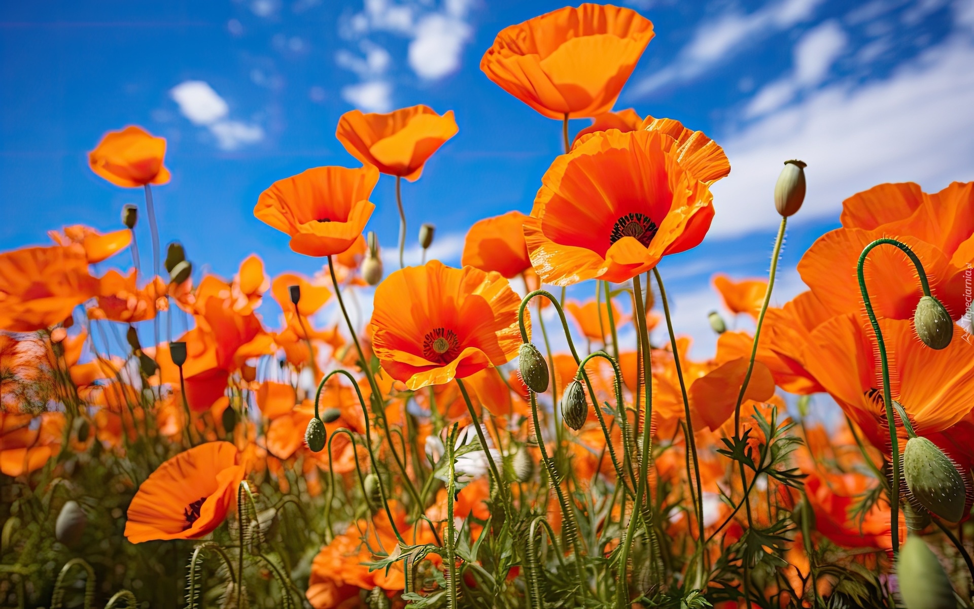 Edytor tapety: Rozkwitnięte czerwone maki na tle nieba