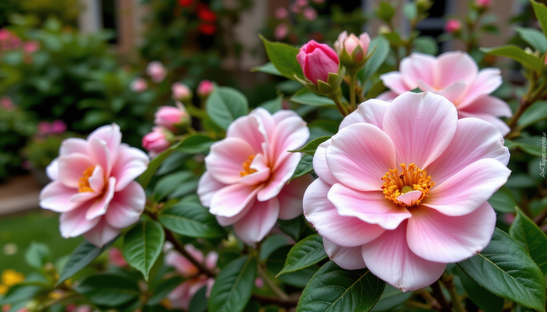 Edytor tapety: Jasnoróżowe kwiaty kamelii w zbliżeniu