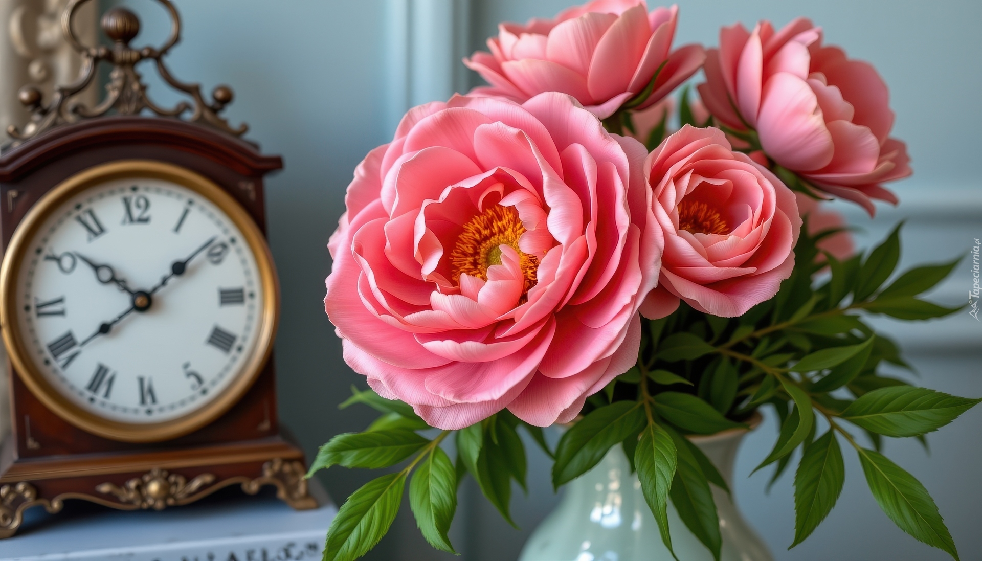 Edytor tapety: Rozkwitnięte różowe piwonie w wazonie obok zegara