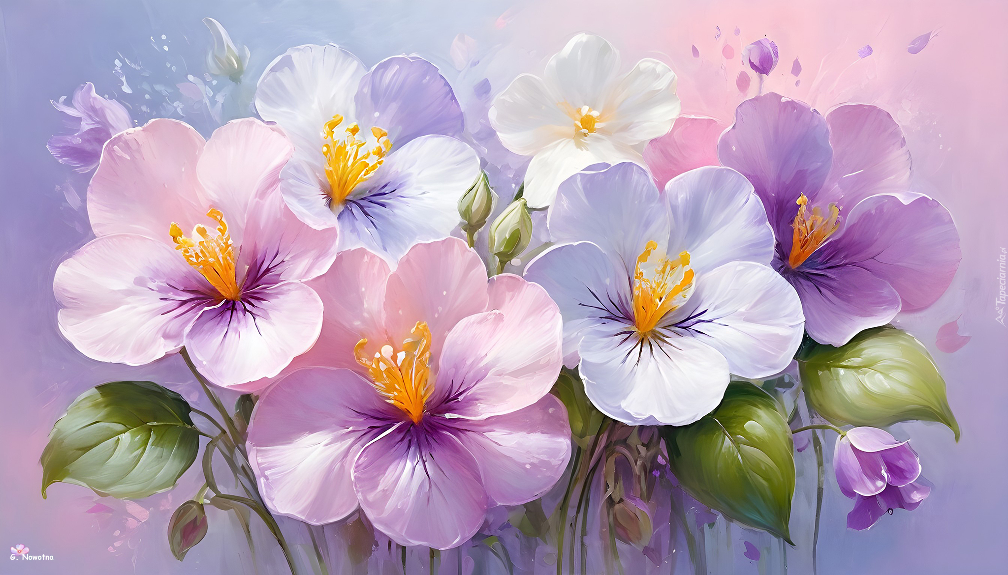 Edytor tapety: Różowe i białe rozkwitnięte kwiaty na kolorowym tle