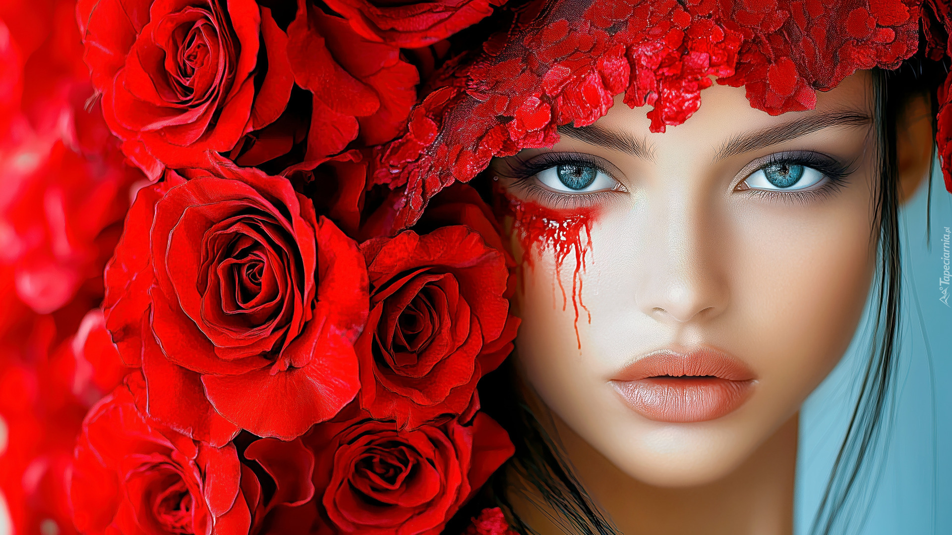 Edytor tapety: Twarz dziewczyny obok czerwonych róż