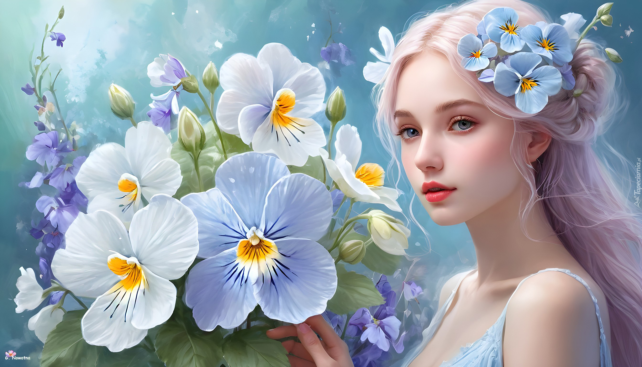 Edytor tapety: Blondynka obok niebieskich i białych kwiatów