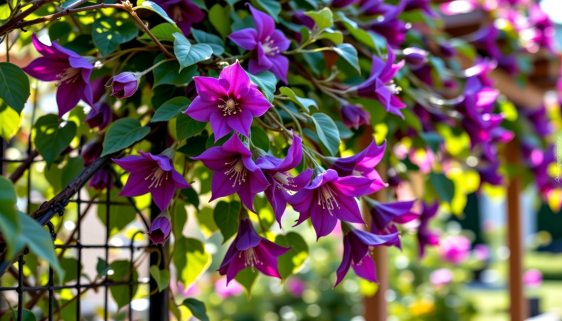 Edytor tapety: Pnącze z fioletowymi kwiatami na ogrodzeniu