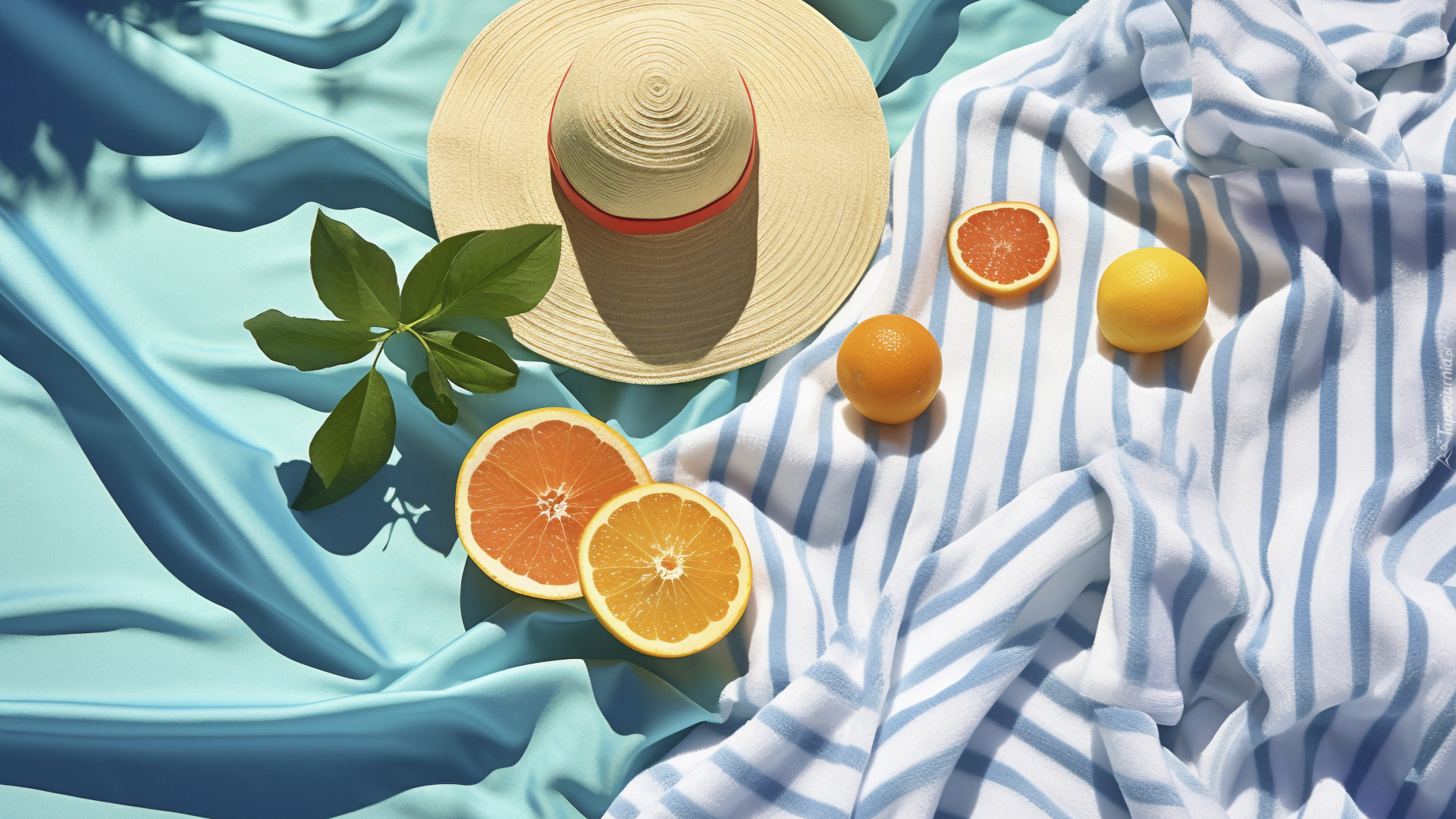 Edytor tapety: Słomkowy kapelusz i pomarańcze na materiale w paski