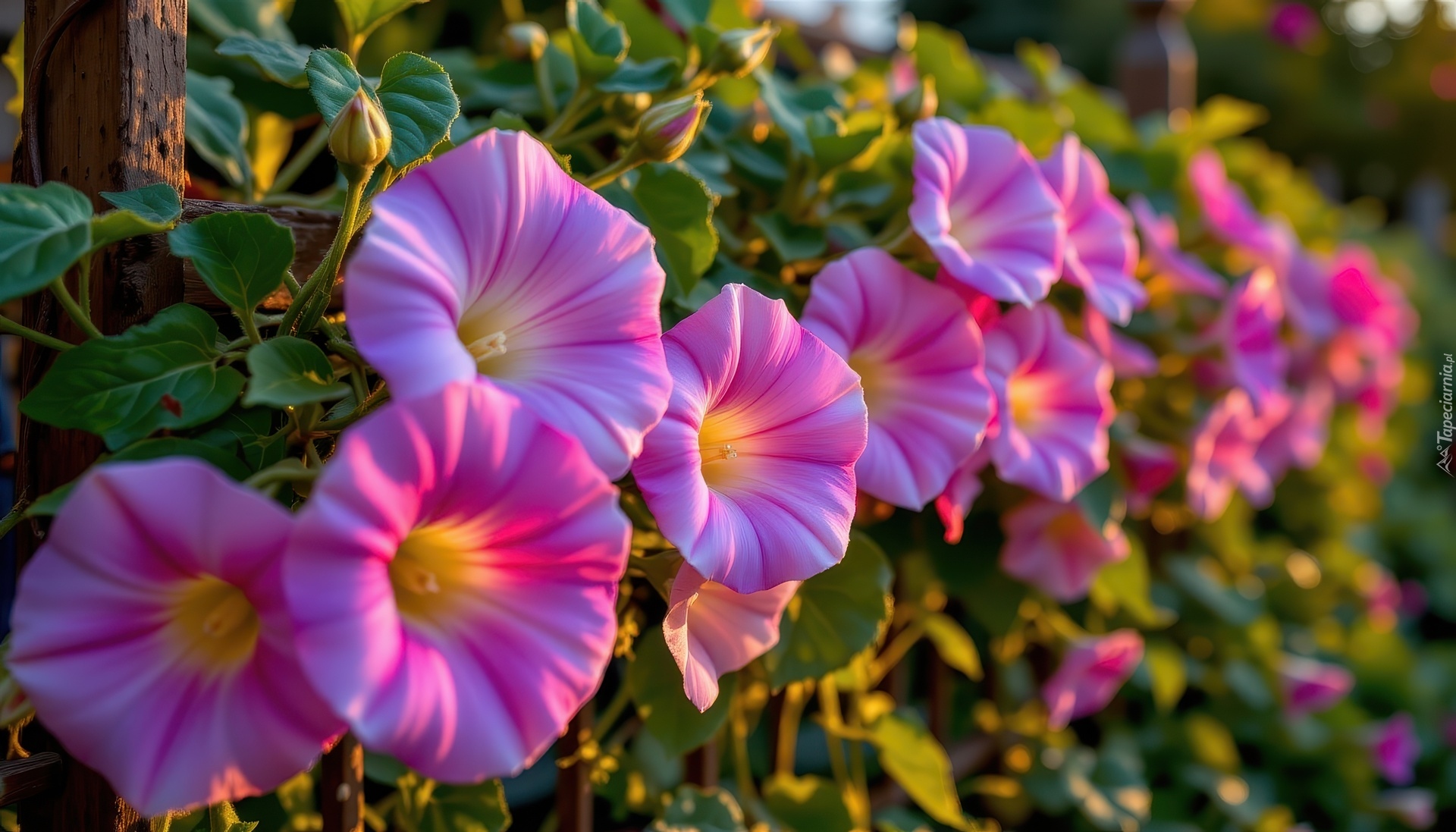 Edytor tapety: Rozświetlone słonecznym światłem różowe kwiaty powoju na ogrodzeniu