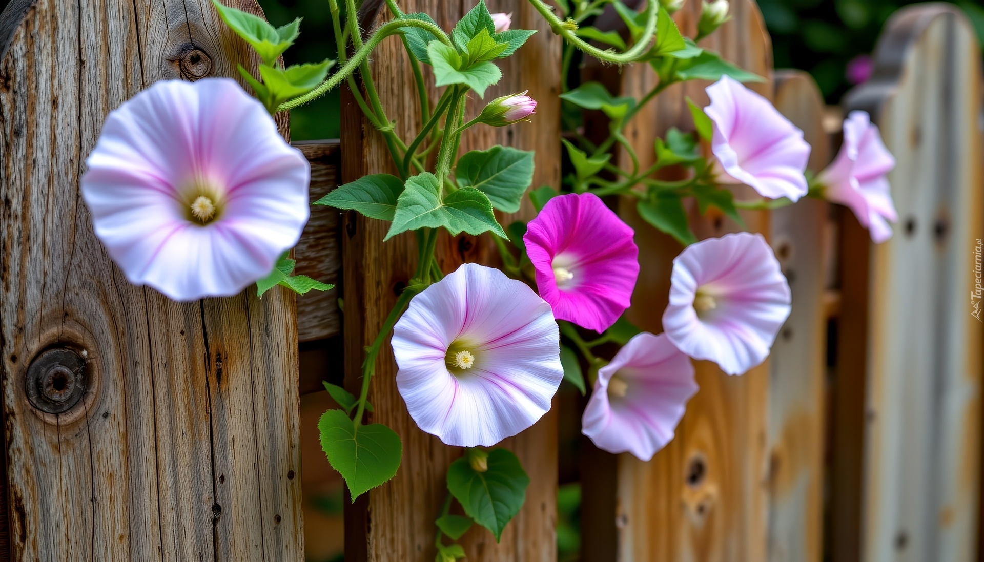 Edytor tapety: Pnącze z kwiatami powoju na płocie