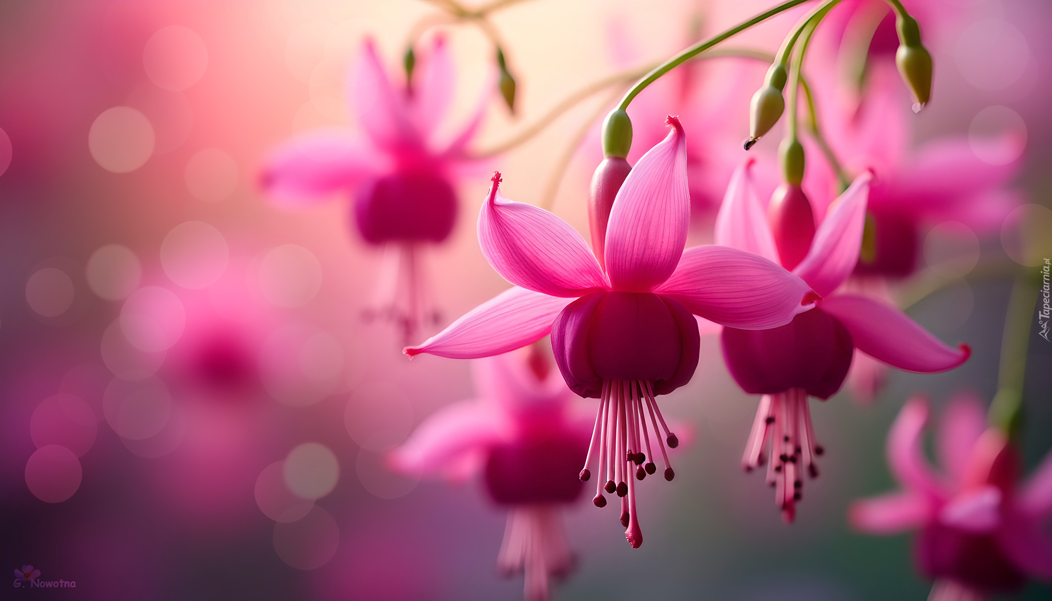 Edytor tapety: Rozkwitnięte różowe fuksje na rozświetlonym i rozmytym tle
