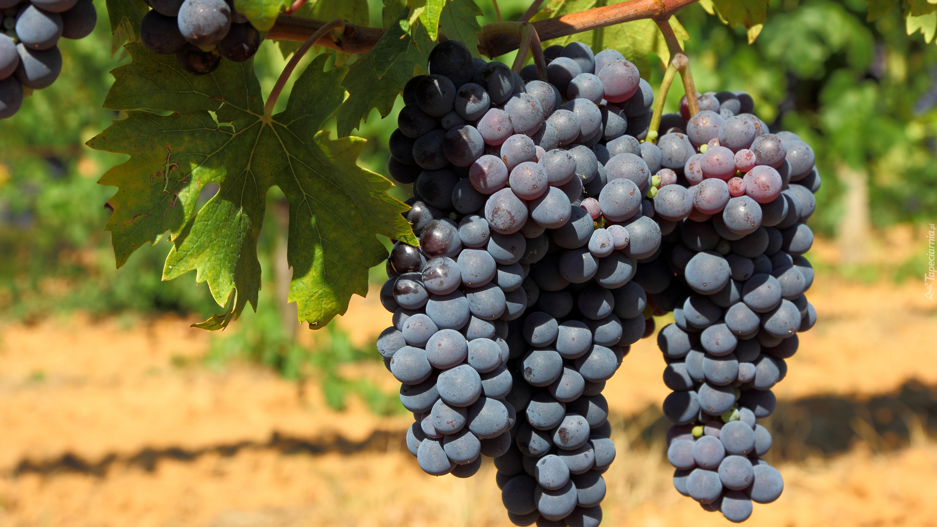 Edytor tapety: Rozświetlone kiście ciemnych winogron na gałęzi