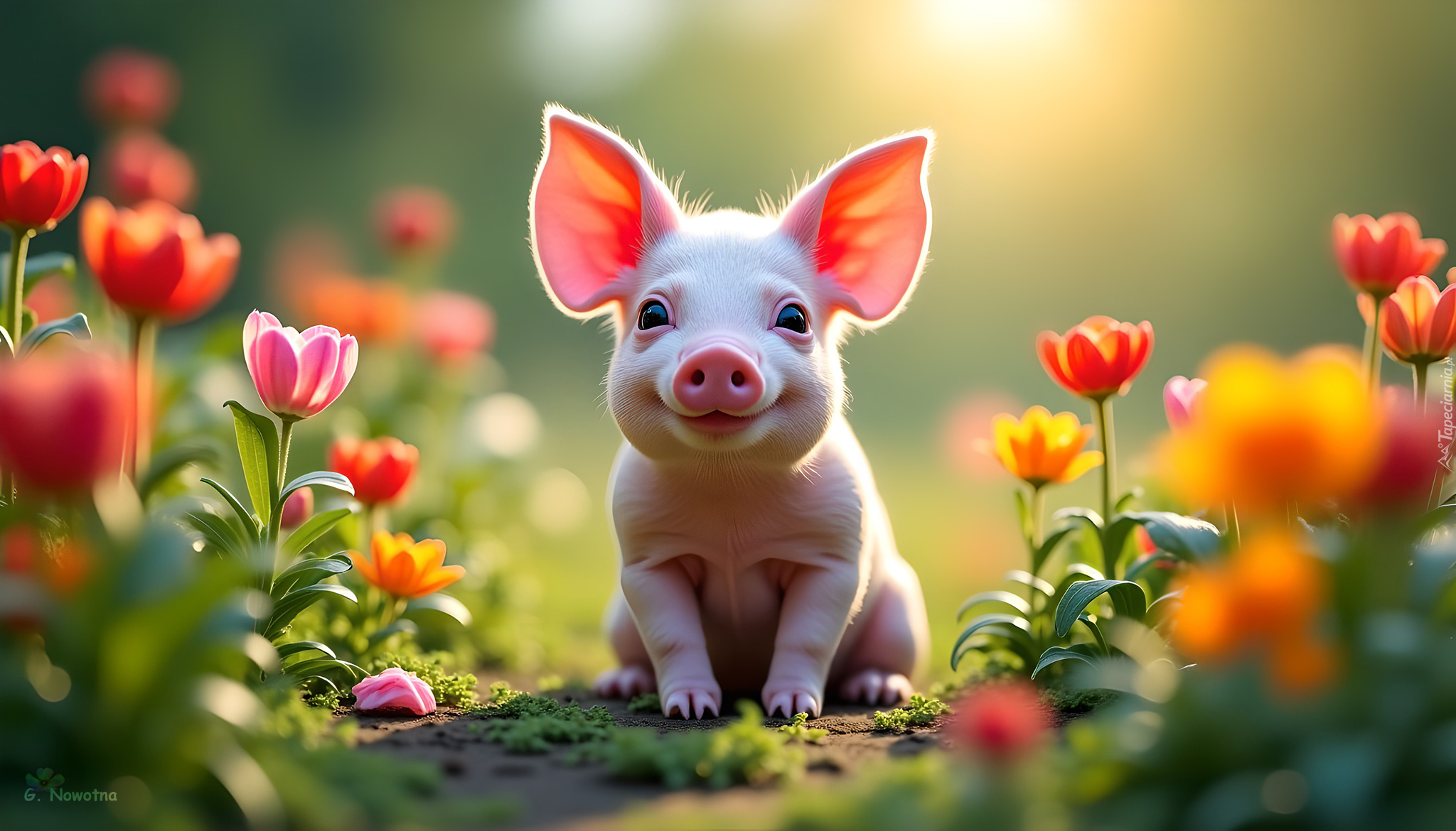 Edytor tapety: Uśmiechnięty prosiaczek siedzący wśród rozświetlonych kwiatów