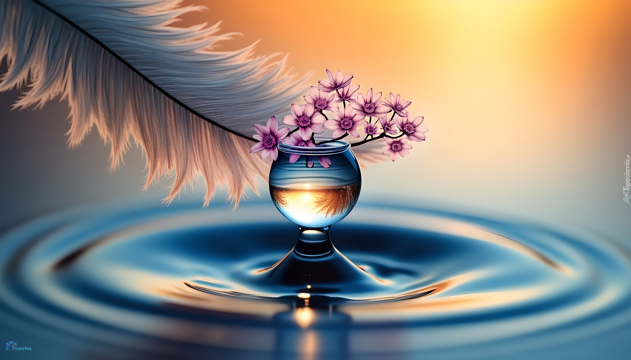 Edytor tapety: Kropla z kwiatami i piórkiem na wodzie