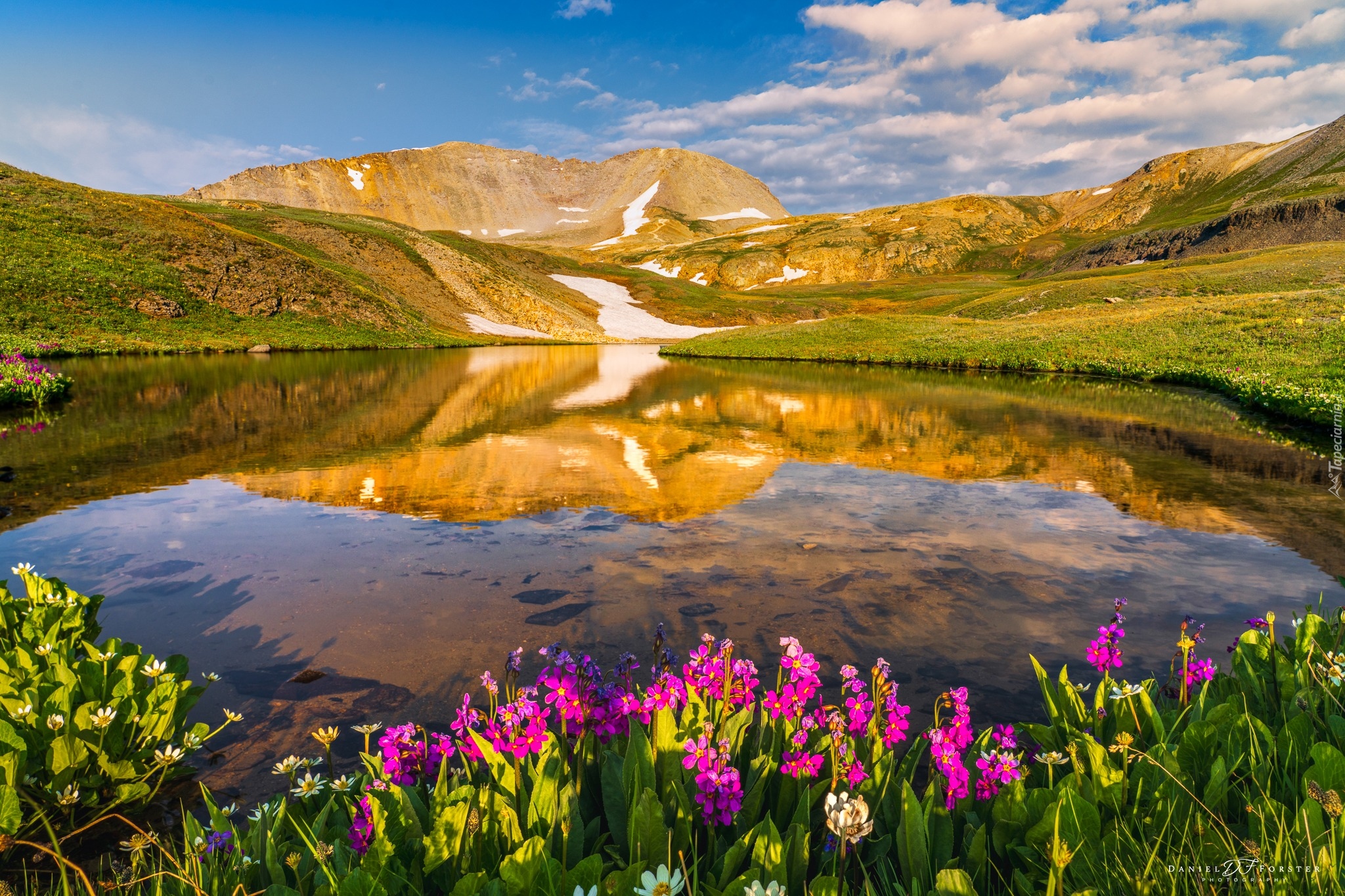 Edytor tapety: Kwiaty i odbicie rozświetlonych gór w jeziorze