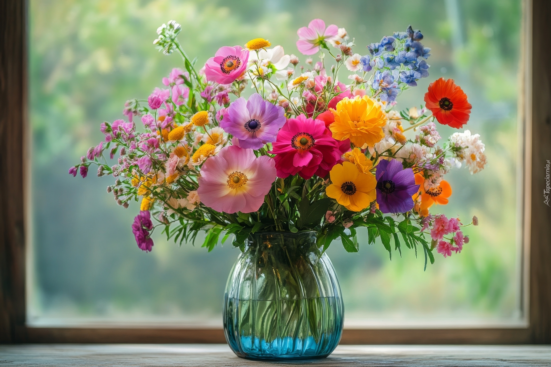Edytor tapety: Kolorowe kwiaty w szklanym wazonie przy oknie