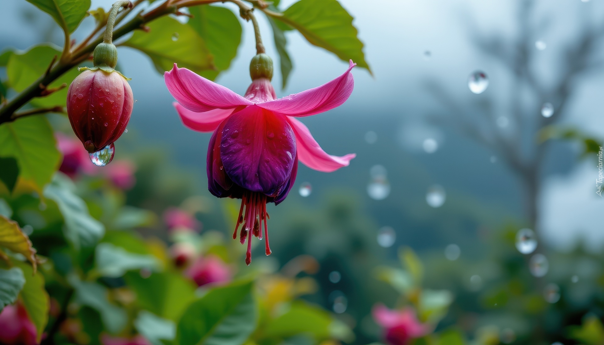 Edytor tapety: Krople na różowych kwiatach fuksji
