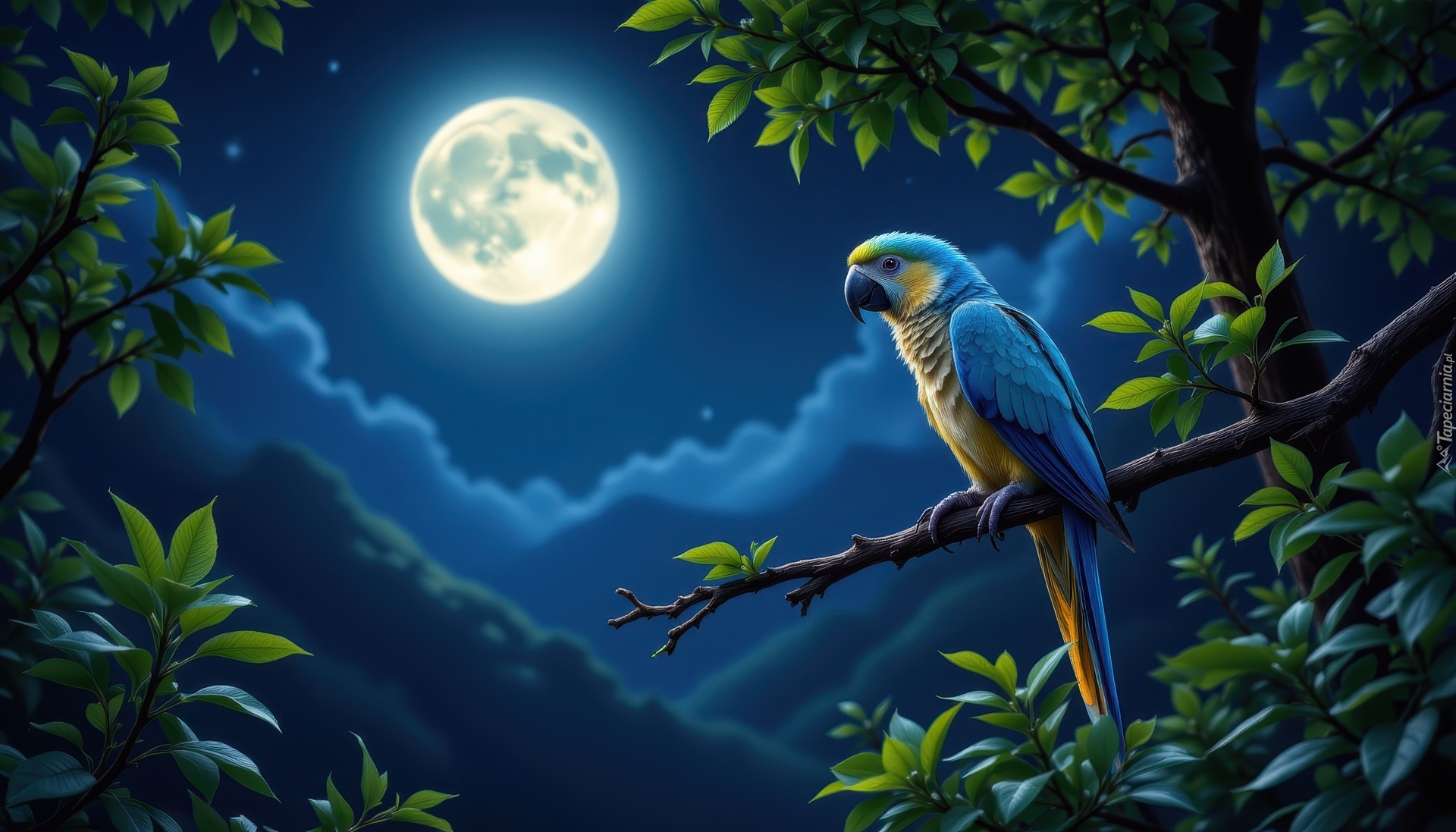 Edytor tapety: Ara na gałązce drzewa w blasku księżyca