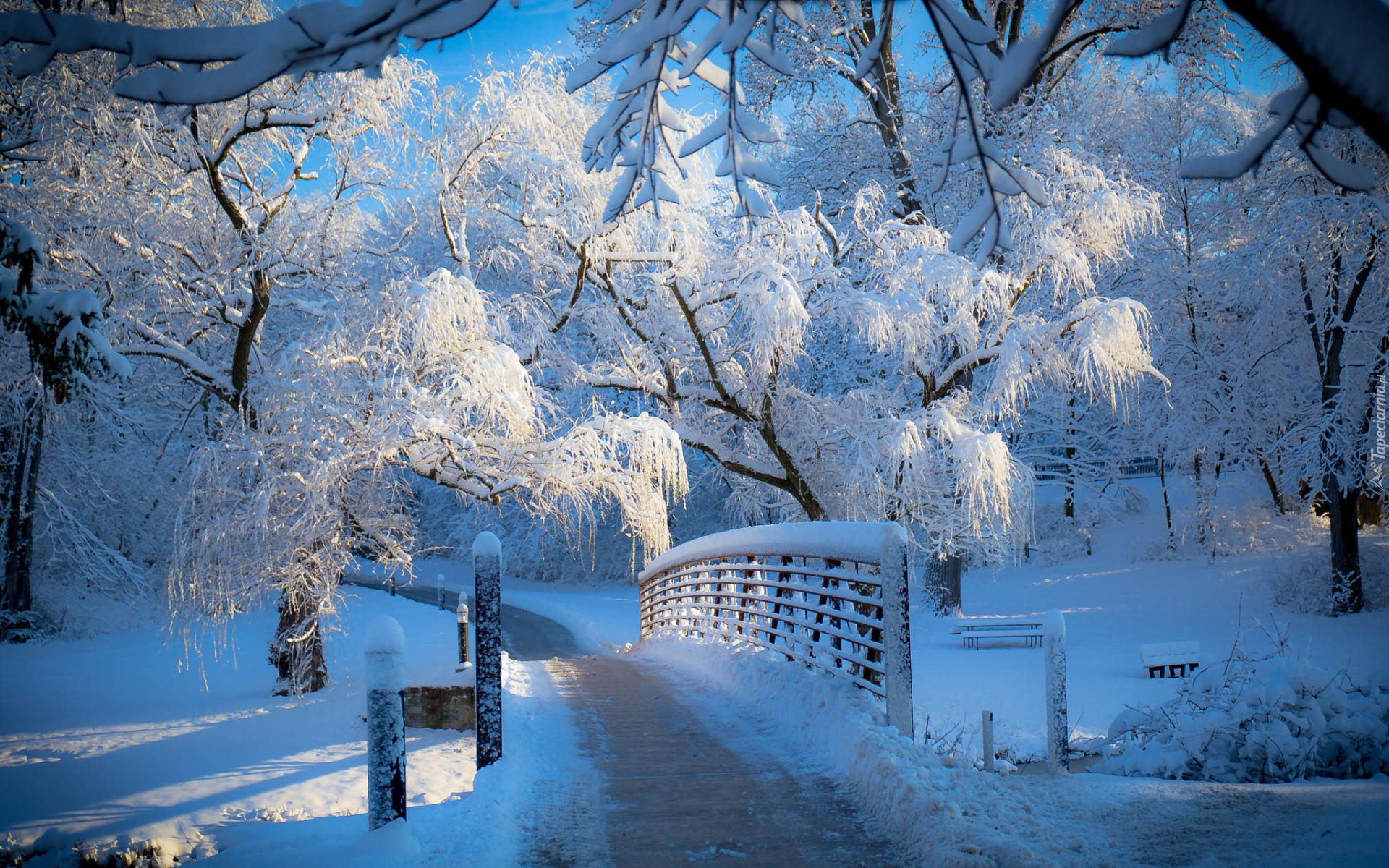 Edytor tapety: Ośnieżony most i drzewa w zimowym parku