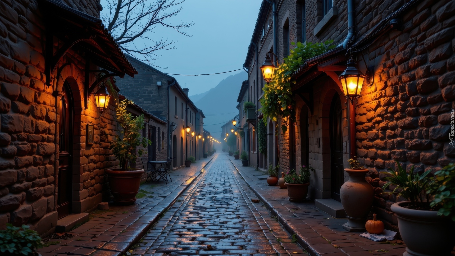 Edytor tapety: Zapalone latarnie na domach przy wąskiej brukowanej ulicy
