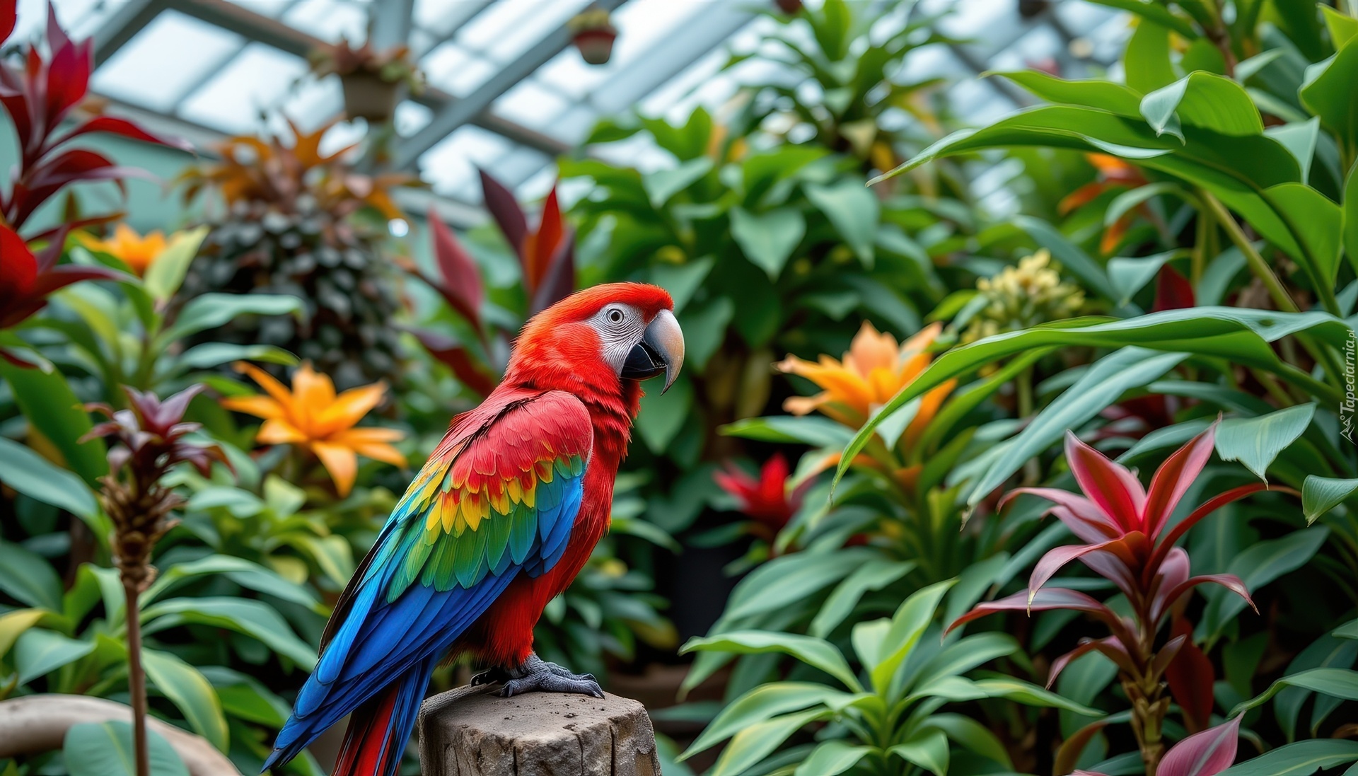 Edytor tapety: Ara wśród kwiatów i roślin w oranżerii