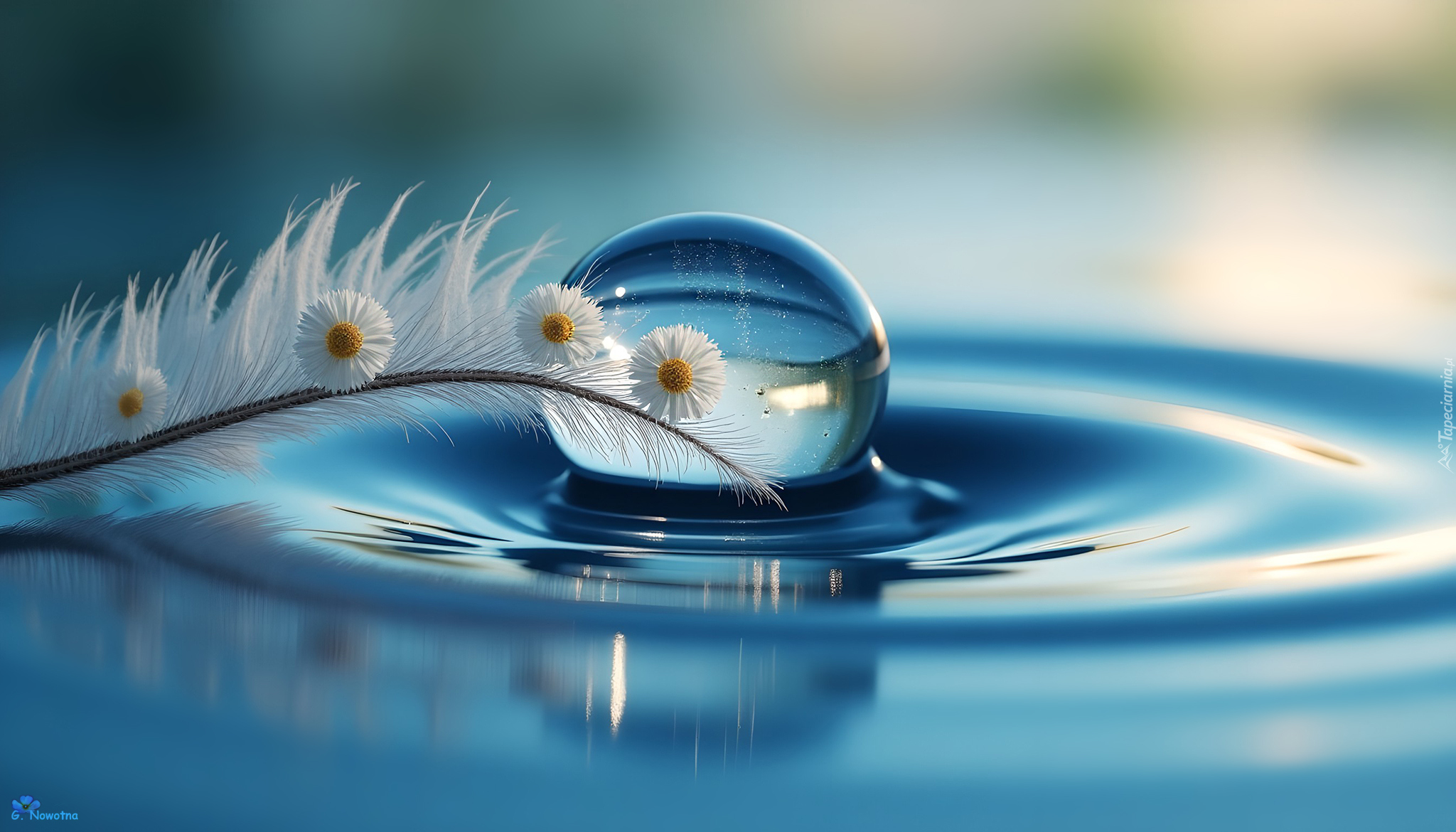 Edytor tapety: Białe kwiaty na piórku obok kropli na wodzie