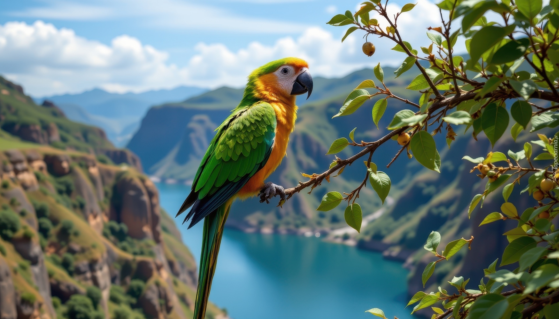 Edytor tapety: Ara na gałązce z widokiem na górską rzekę