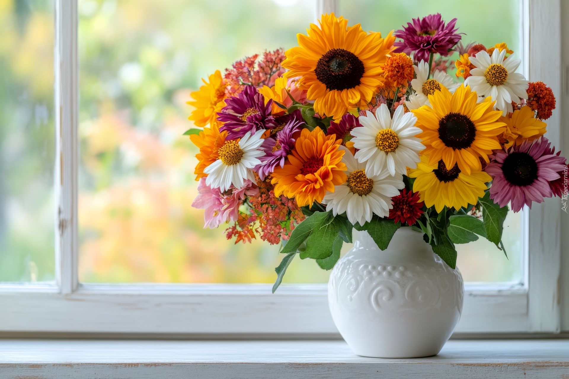 Edytor tapety: Kolorowe kwiaty w białym wazonie przy oknie