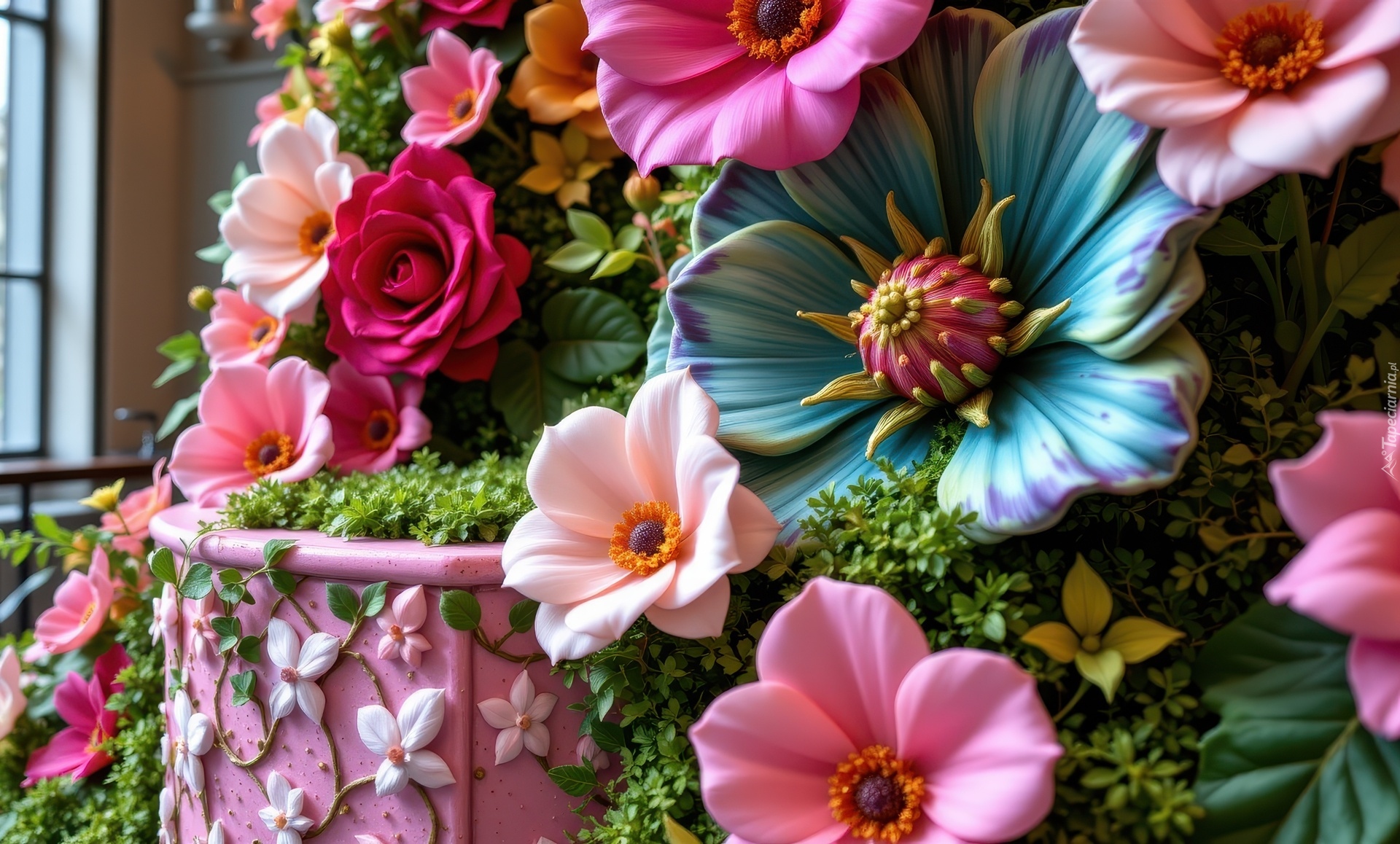 Edytor tapety: Różowe podium z kolorowymi kwiatami w grafice