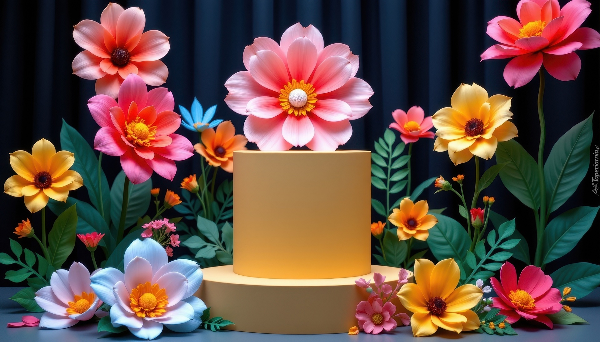 Edytor tapety: Kolorowe papierowe kwiaty obok podium w grafice