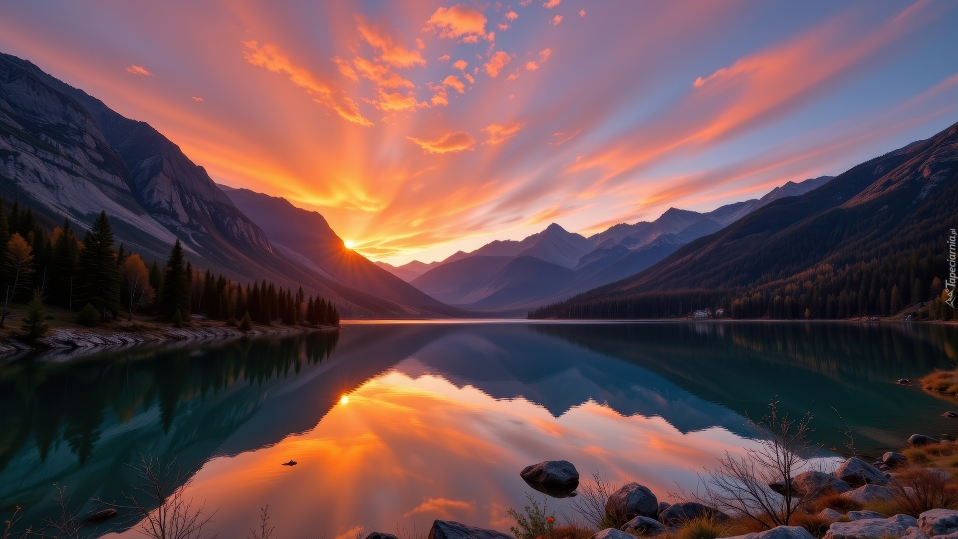 Edytor tapety: Odbicie nieba wschodzącego słońca w górskim jeziorze