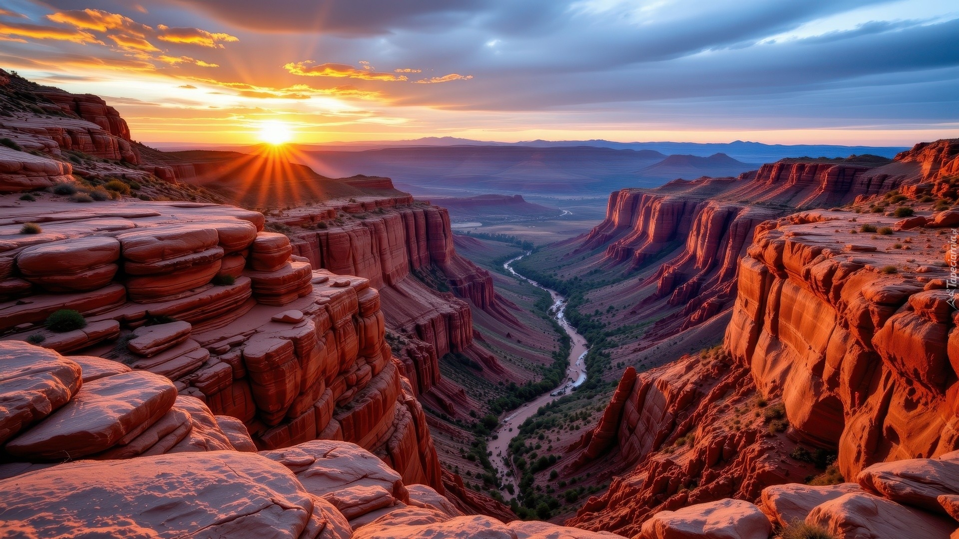 Edytor tapety: Rzeka w rozświetlonym promieniami wschodzącego słońca kanionie