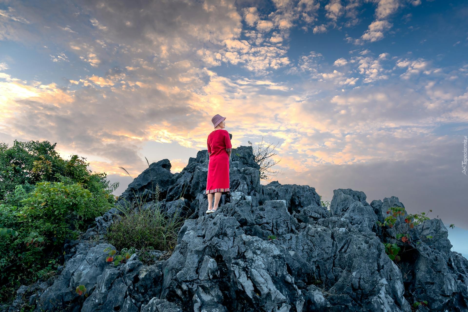 Edytor tapety: Kobieta w czerwonej sukience stojąca na skałach