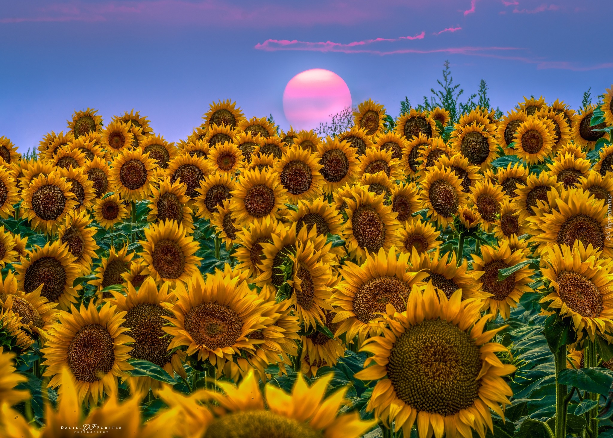 Edytor tapety: Różowy księżyc nad polem słoneczników