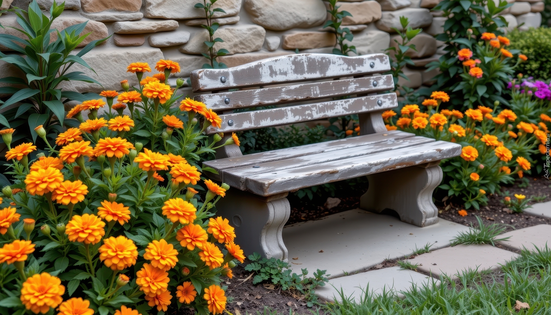 Edytor tapety: Ławka pod murem obok pomarańczowych kwiatów