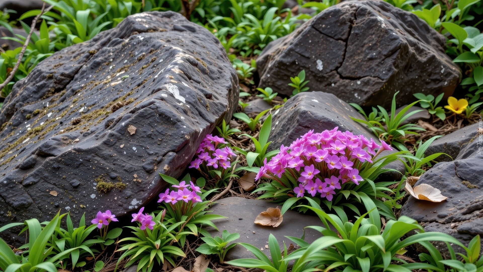 Edytor tapety: Purpurowe kwiaty i rośliny obok kamieni
