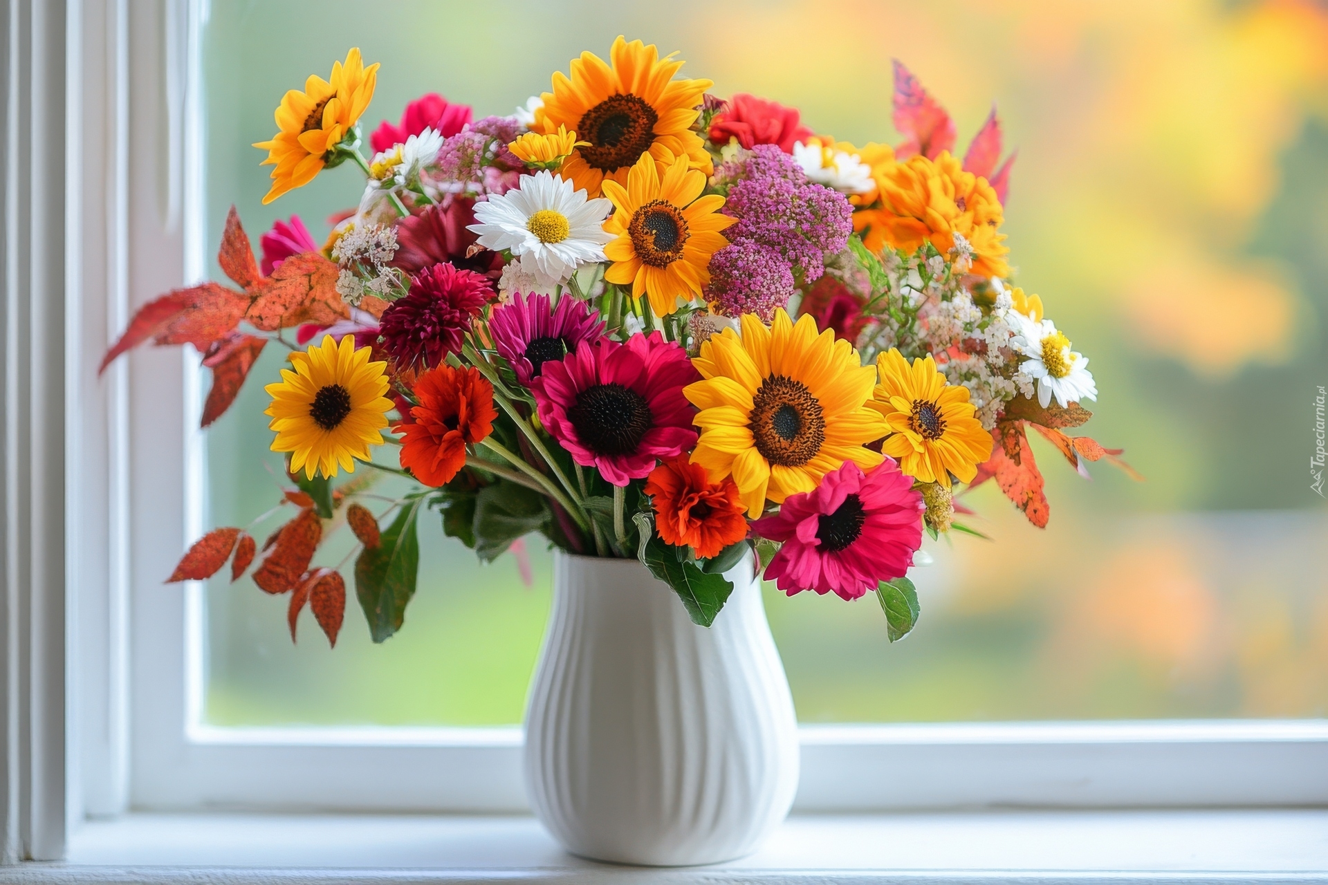 Edytor tapety: Bukiet kolorowych kwiatów w białym wazonie przy oknie