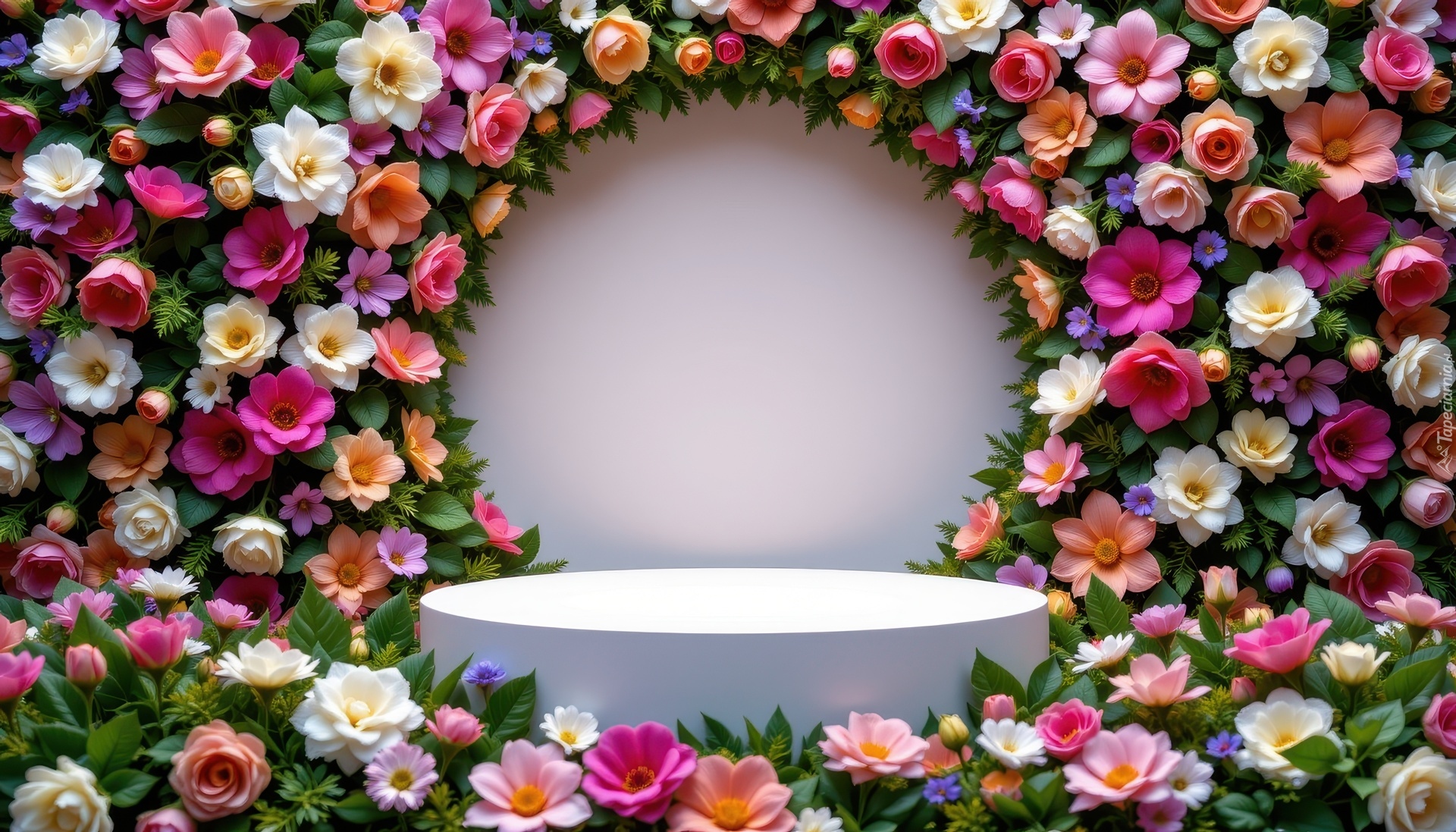 Edytor tapety: Białe podium wśród kolorowych kwiatów w grafice