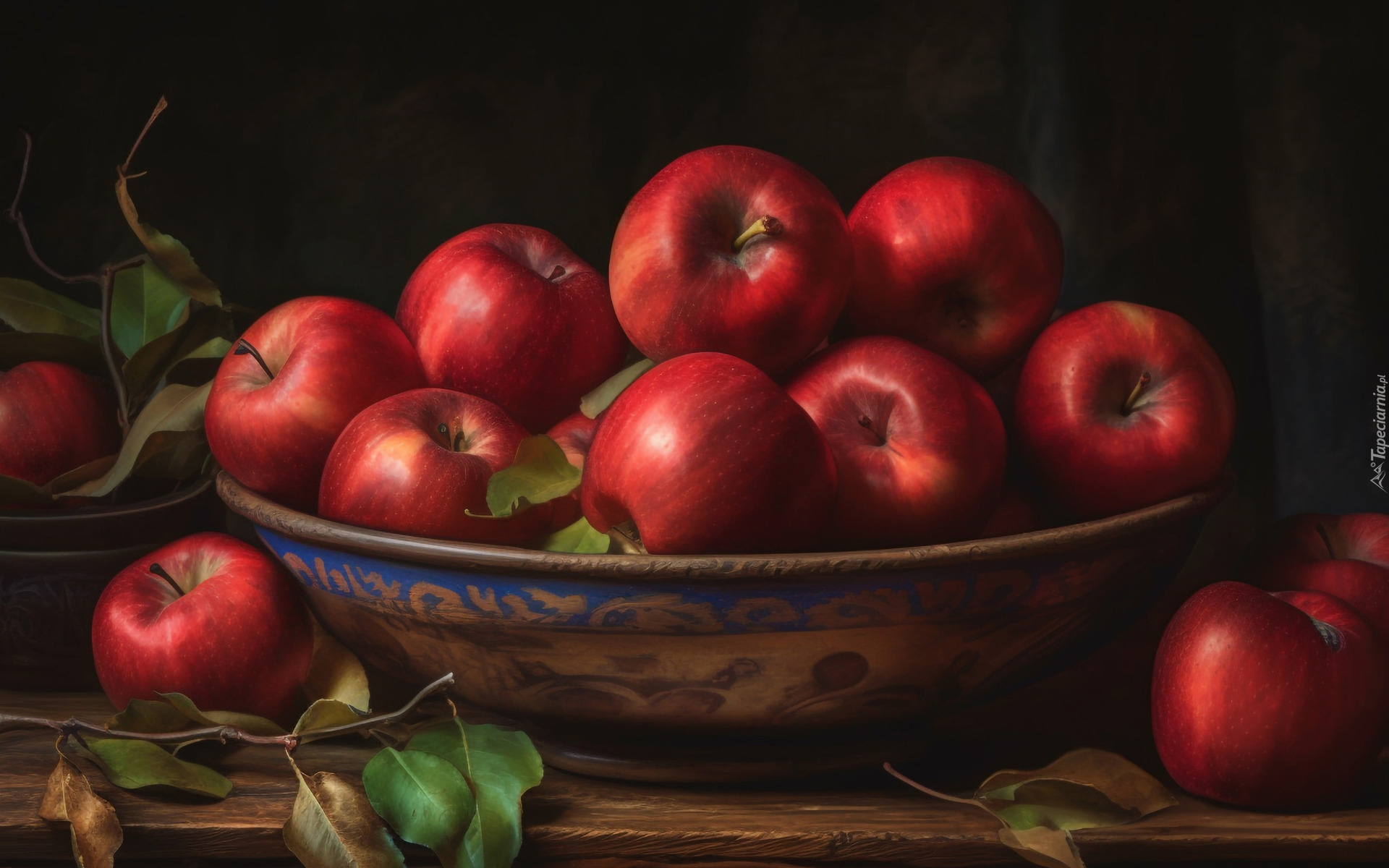 Edytor tapety: Czerwone jabłka w misce i obok na stole