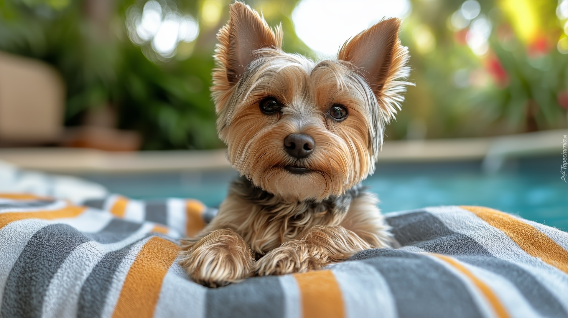 Edytor tapety: Leżący yorkshire terrier na ręczniku
