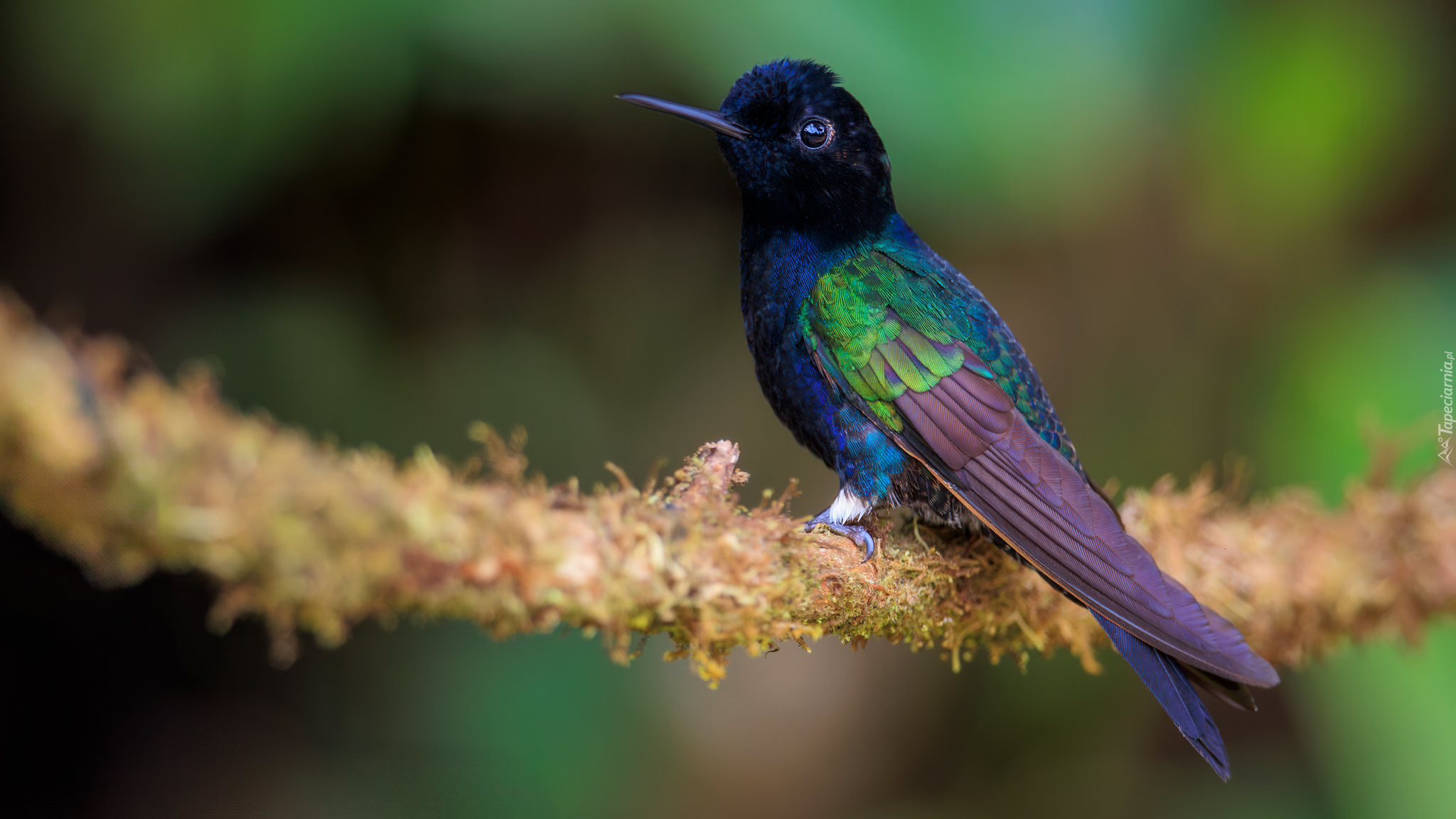 Edytor tapety: Koliber amorek szafirowy na omszałej gałązce