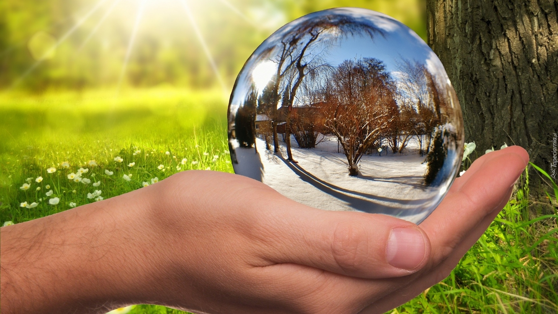 Edytor tapety: Szklana kula w dłoni na tle łąki