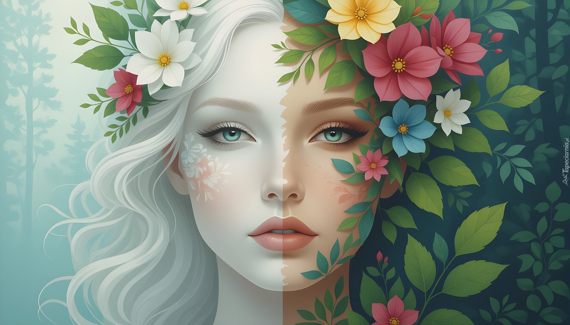 Edytor tapety: Kwiaty na twarzy dziewczyny i we włosach