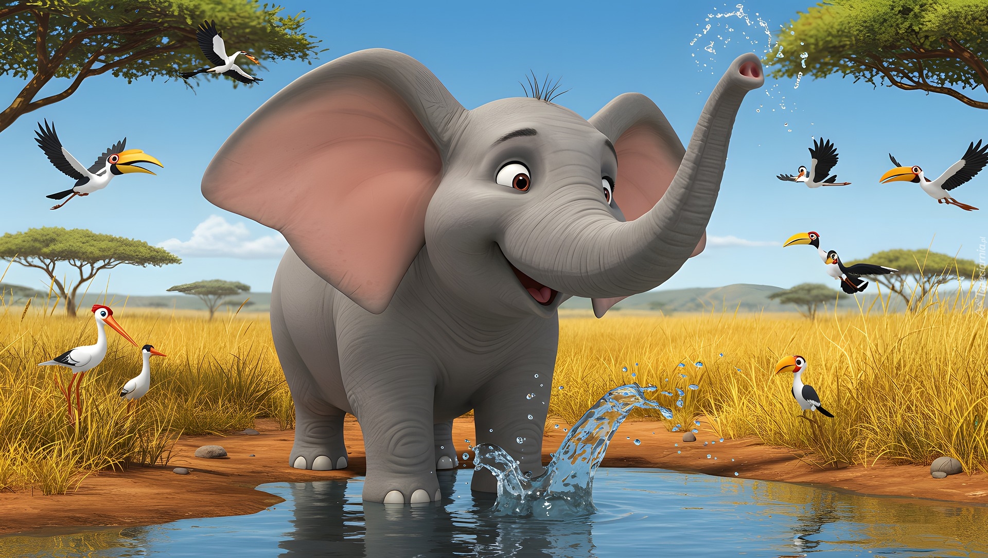Edytor tapety: Uśmiechnięty słoń w wodzie obok ptaków