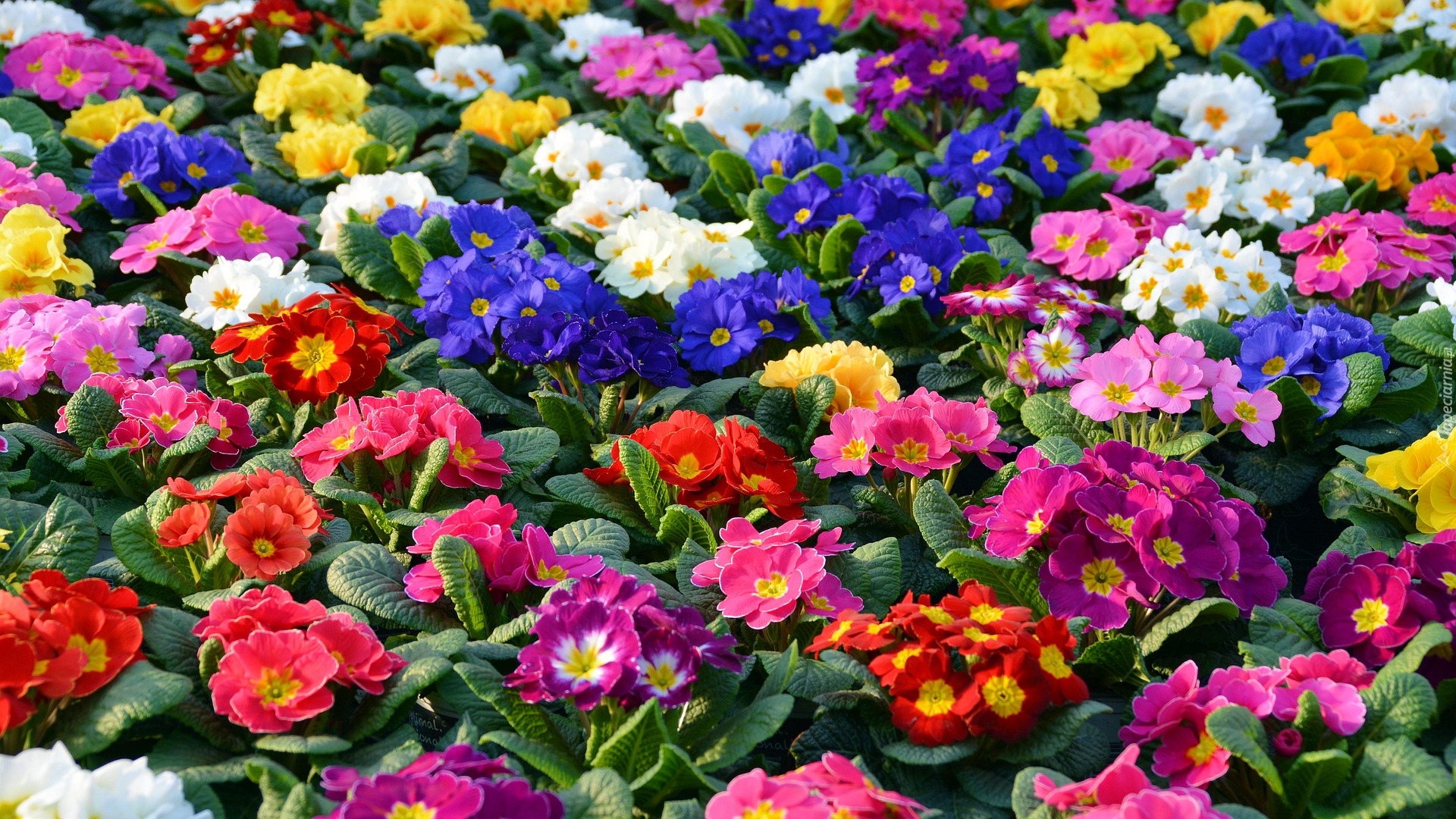 Edytor tapety: Kolorowe prymulki w słonecznym blasku